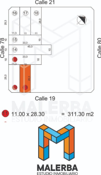 Se trata del Lote 11, ante–esquina, con una superficie total de 311,30 m², distribuidos en 11 metros de frente sobre calle 19 por 28,30 metros de fondo.